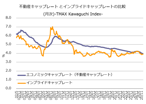 インプライドキャップレートと不動産キャップレートの時系列データ